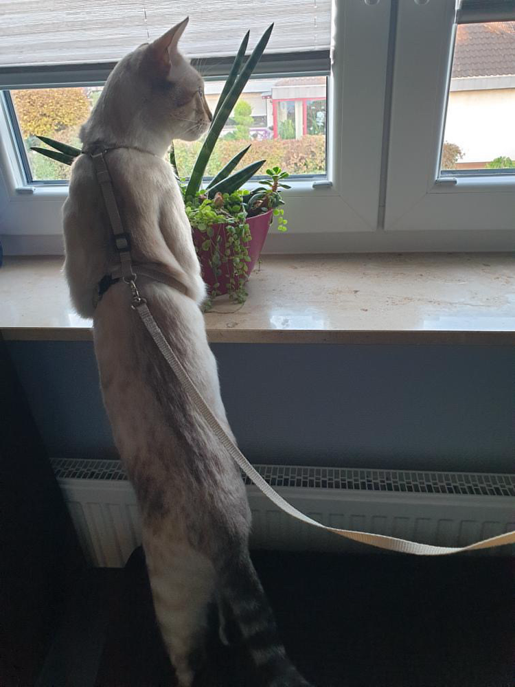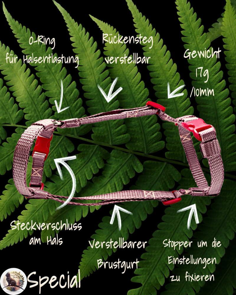 Das Spezial ist ein echtes Feintuning-Geschirr für Katzen mit besonderen Anforderungen: Es liegt leicht, eng anliegend und präzise geführt auf dem Rippenbogen, kommt ganz ohne überflüssige Polsterwülste aus und passt sich filigranen Körperformen ideal an. Der mittig geführte Brustgurt bietet zusätzliche Stabilität ohne die Schultern einzuengen.